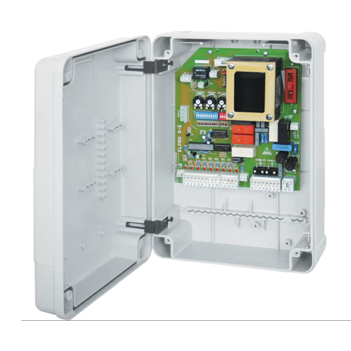 Intuitive settings by trimmers and dip-switches: dedicated output for electric lock, storing of time settings, torque control for electromechanical motor operators, external clock, traffic lights up to 3 lights, diagnostic green/red LED lights to easily assess the operator status. Box size 210x295x110 mm. Grade of protection IP 64. Working temperature -20 °C +55 °C.
